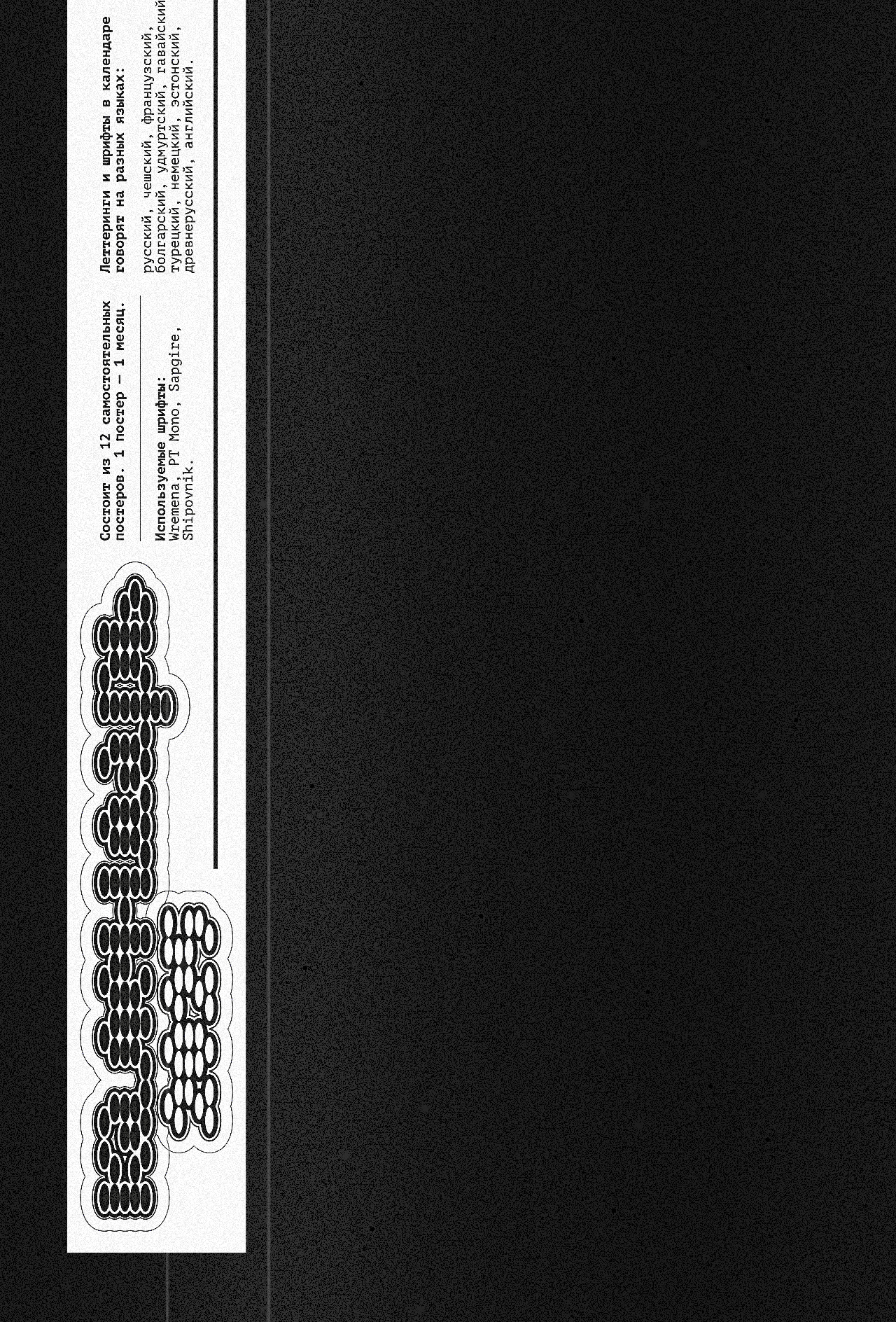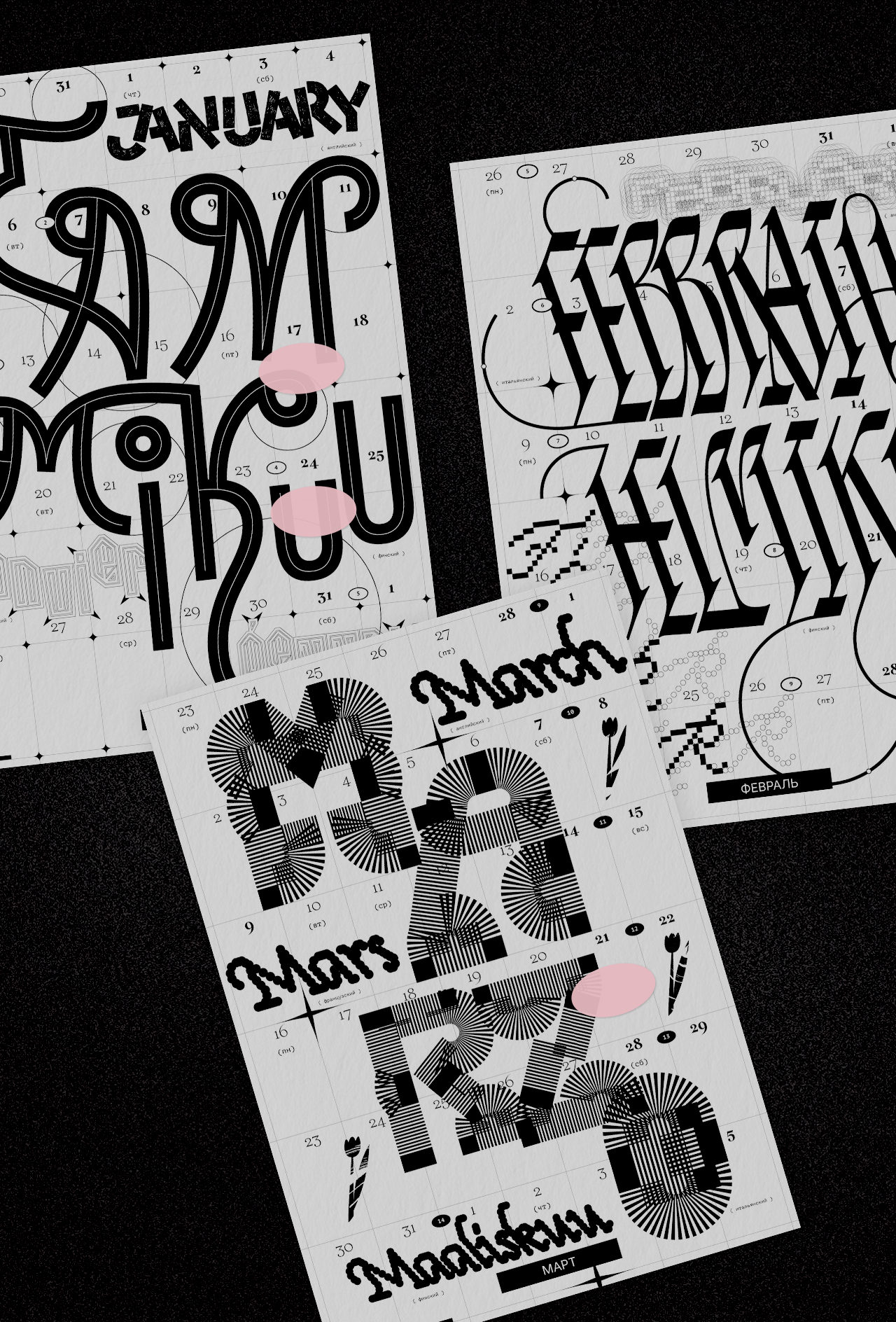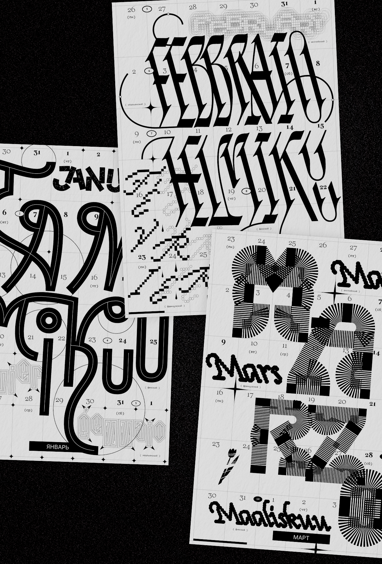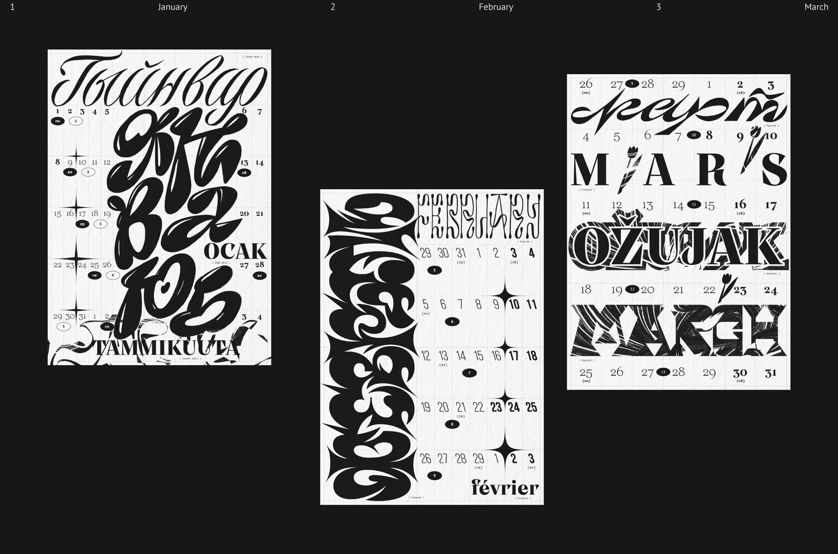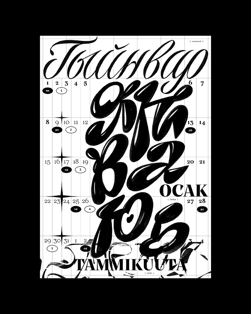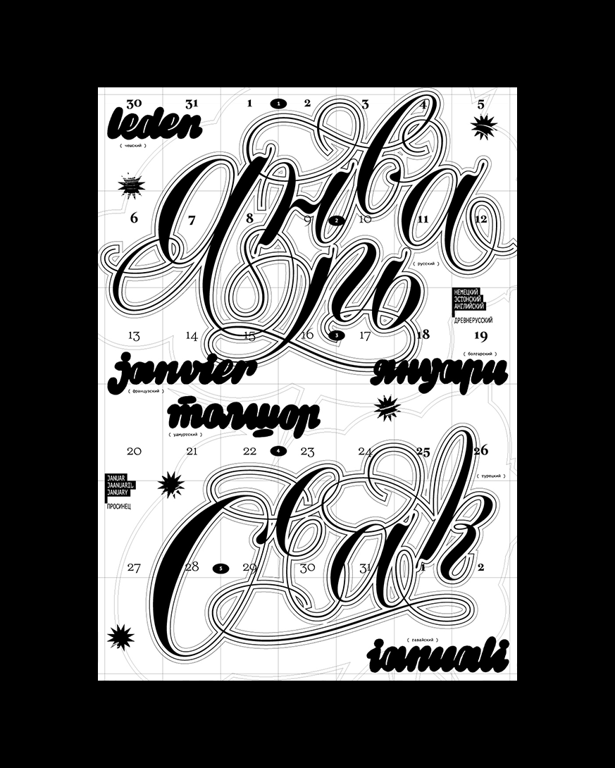 Леттеринг и шрифты в календаре говорят на разных языках: татарский, русский, финский, турецкий, английский, французский, хорватский, польский, португальский, исландский, латвийский, венгерский, чешский, белорусский, украинский, вьетнамский.