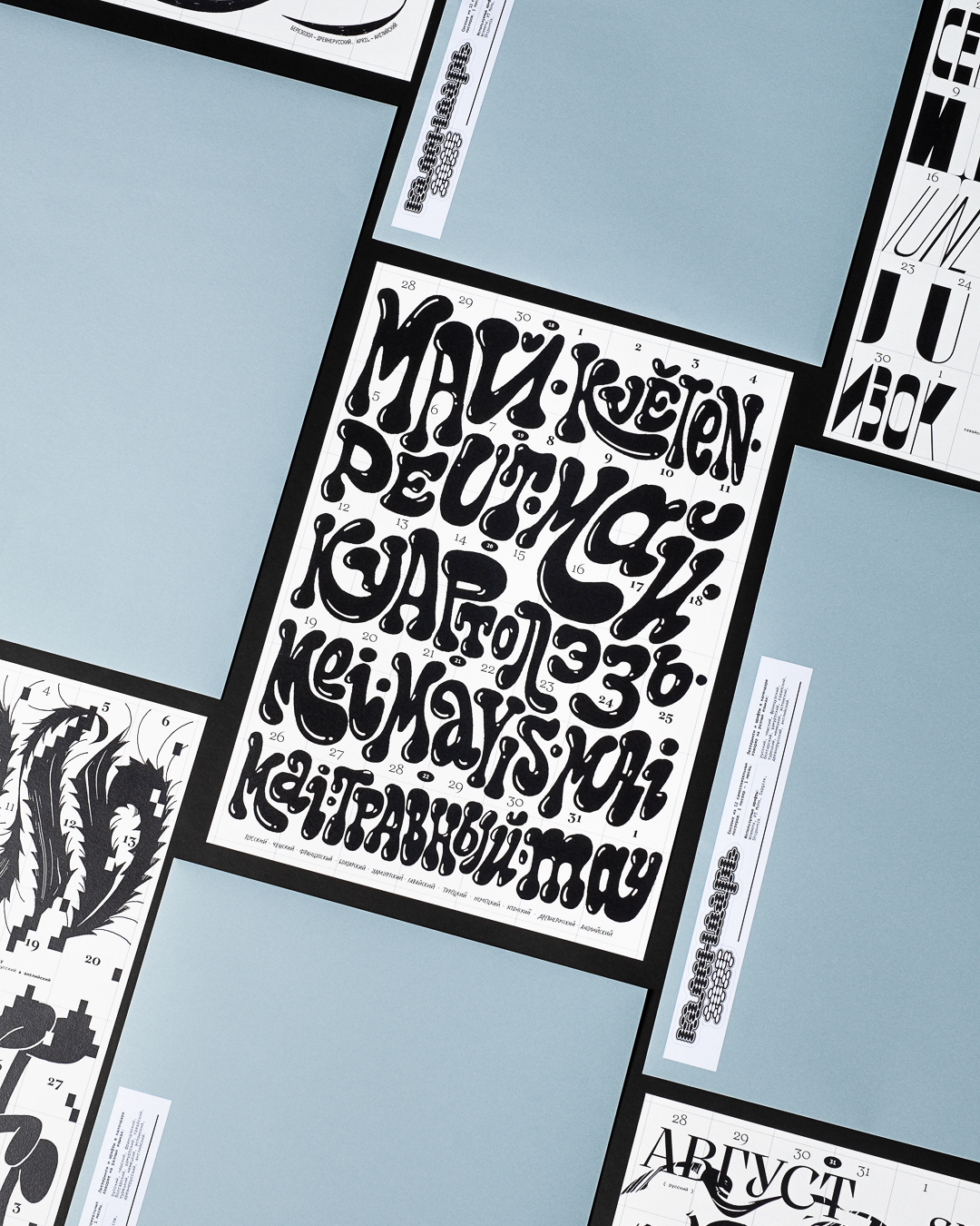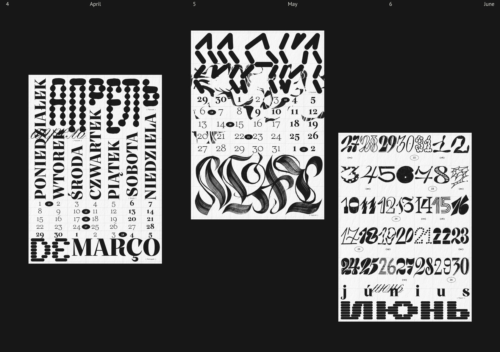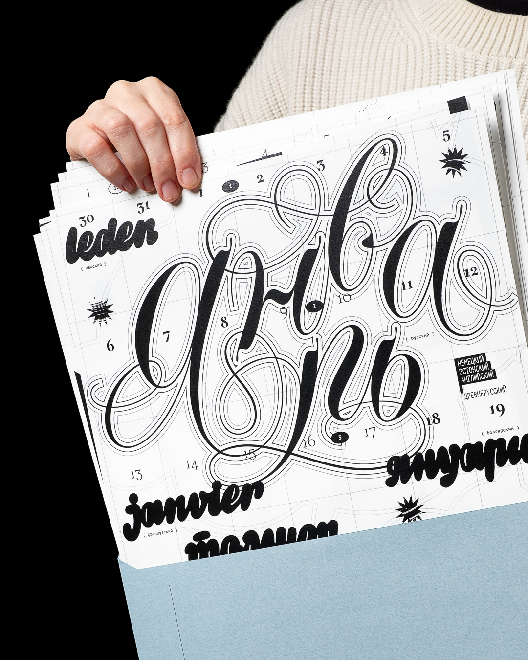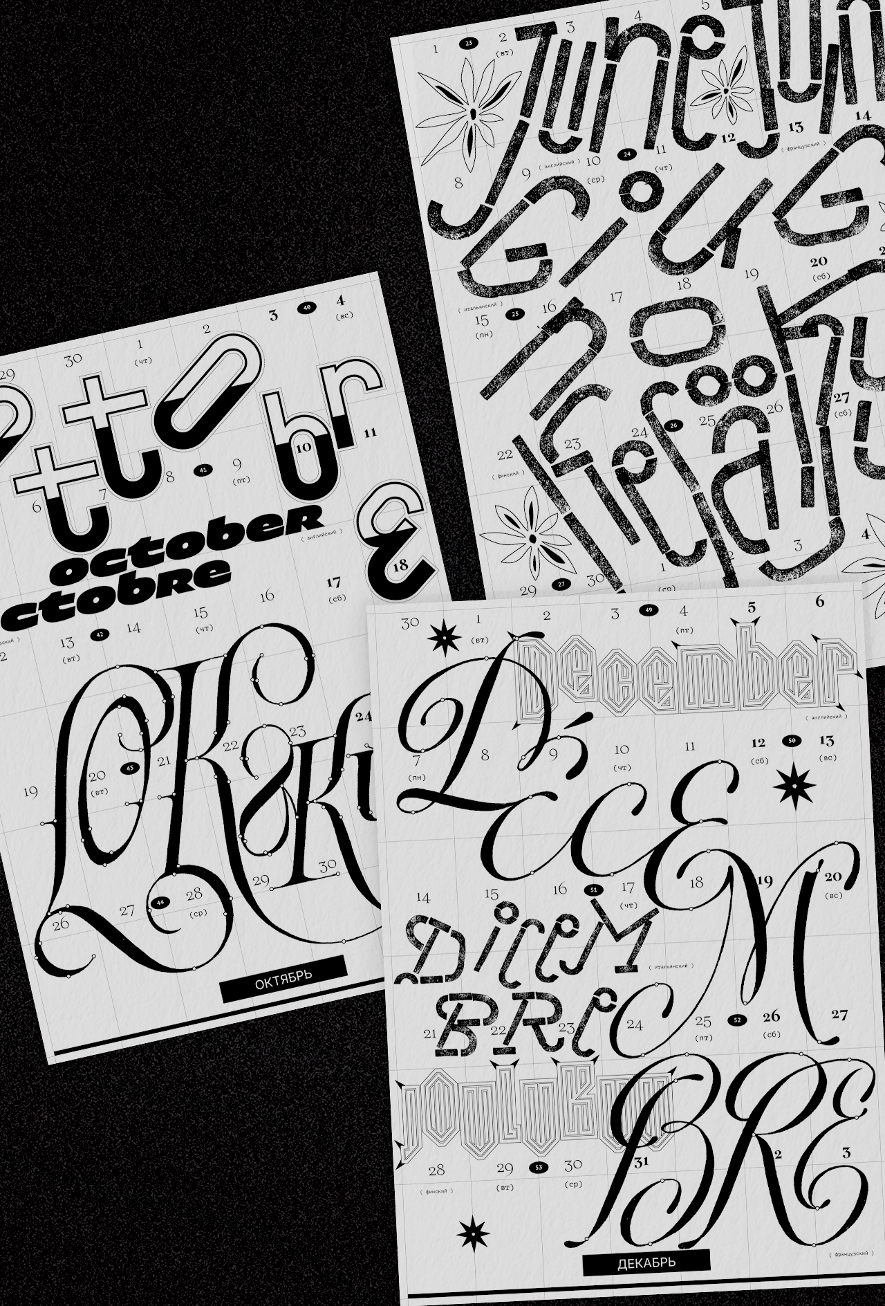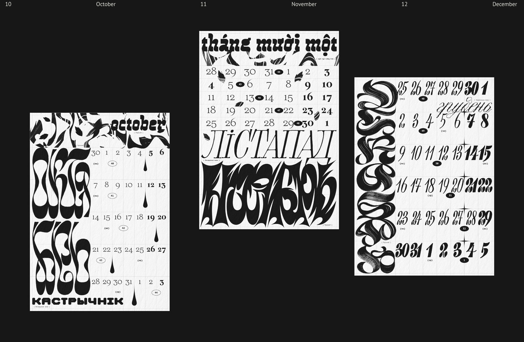 Леттеринг и шрифты в календаре говорят на разных языках: татарский, русский, финский, турецкий, английский, французский, хорватский, польский, португальский, исландский, латвийский, венгерский, чешский, белорусский, украинский, вьетнамский.