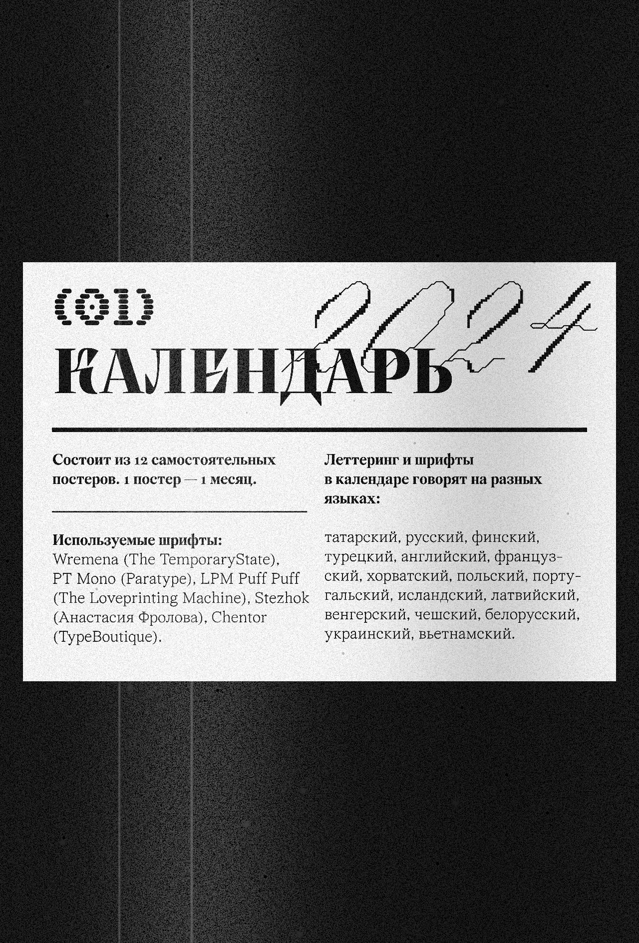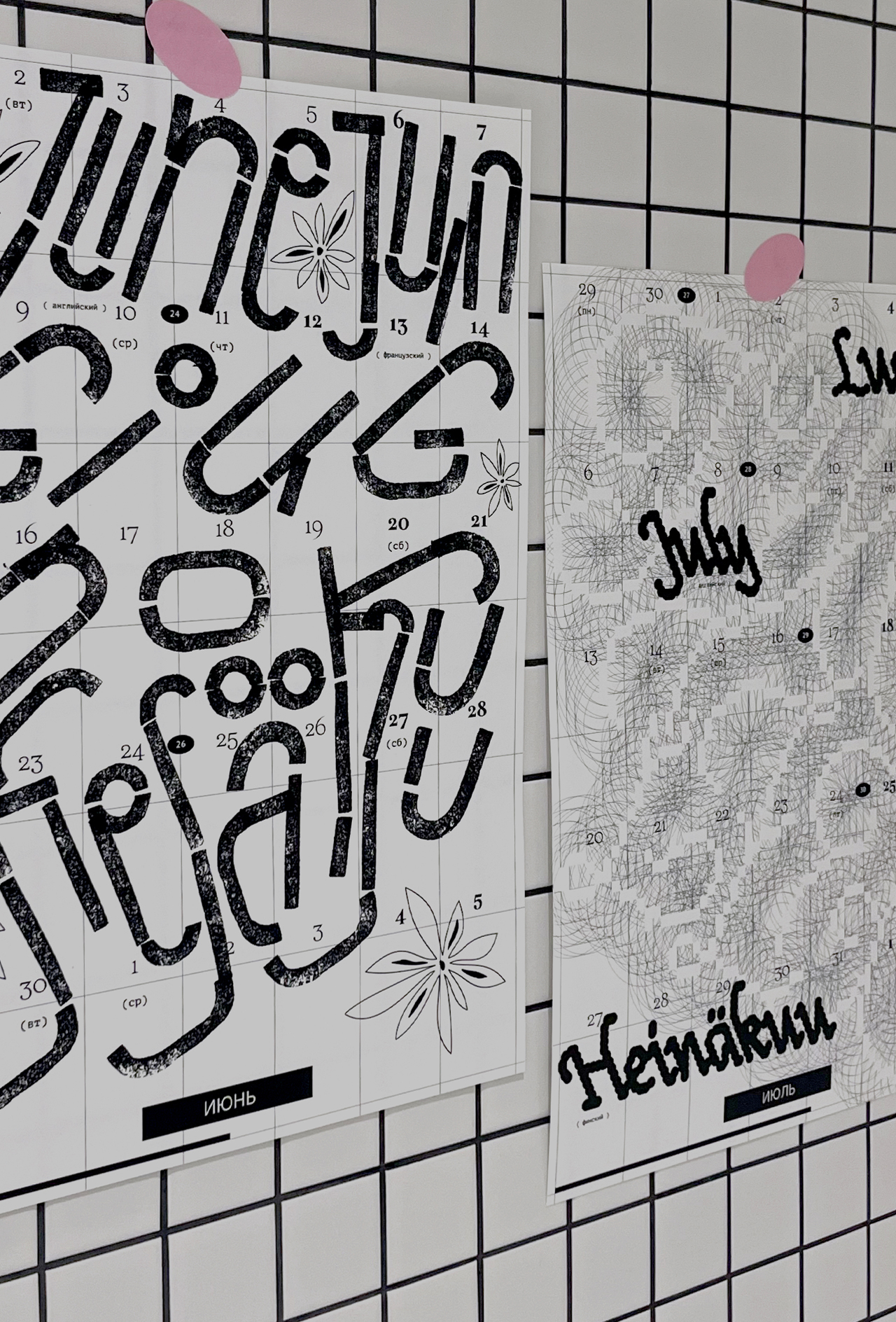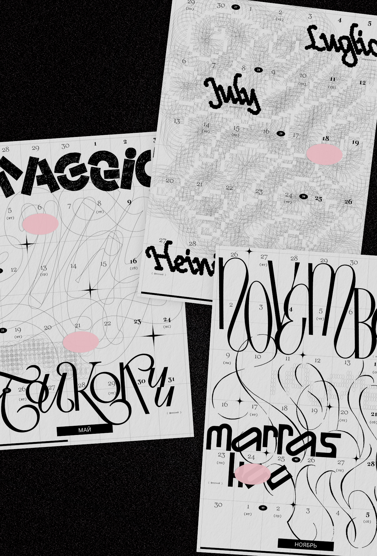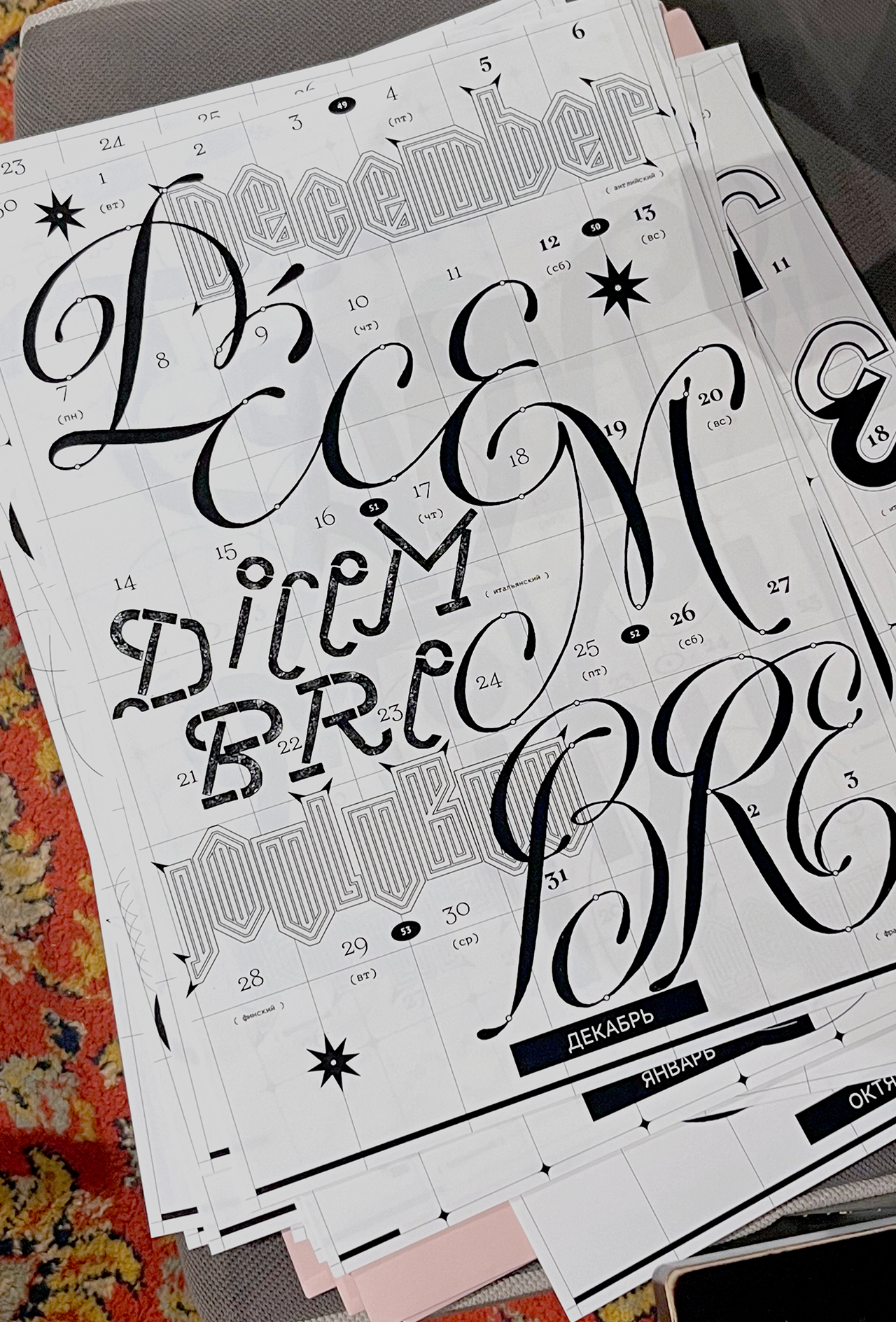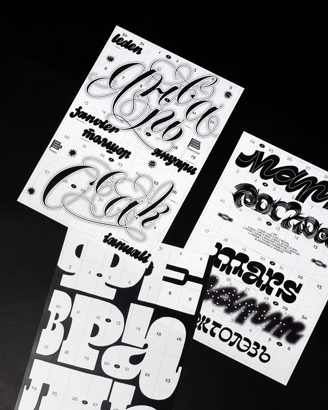 Леттеринг и шрифты в календаре говорят на разных языках: татарский, русский, финский, турецкий, английский, французский, хорватский, польский, португальский, исландский, латвийский, венгерский, чешский, белорусский, украинский, вьетнамский.