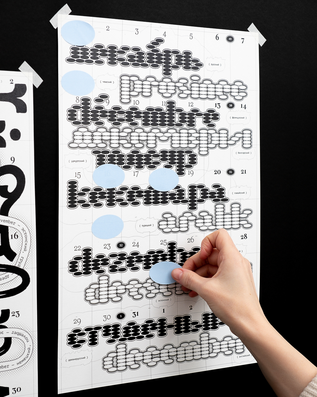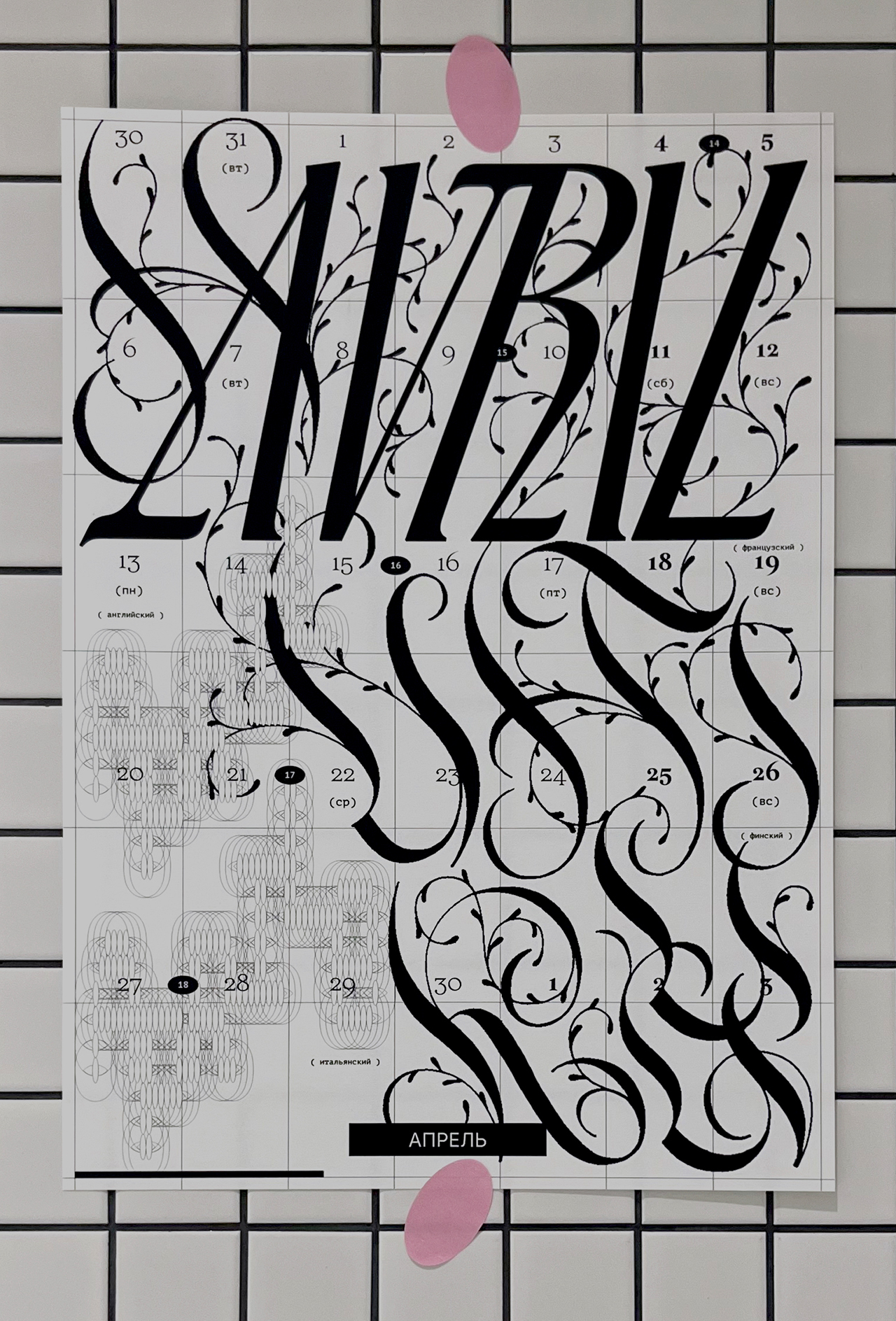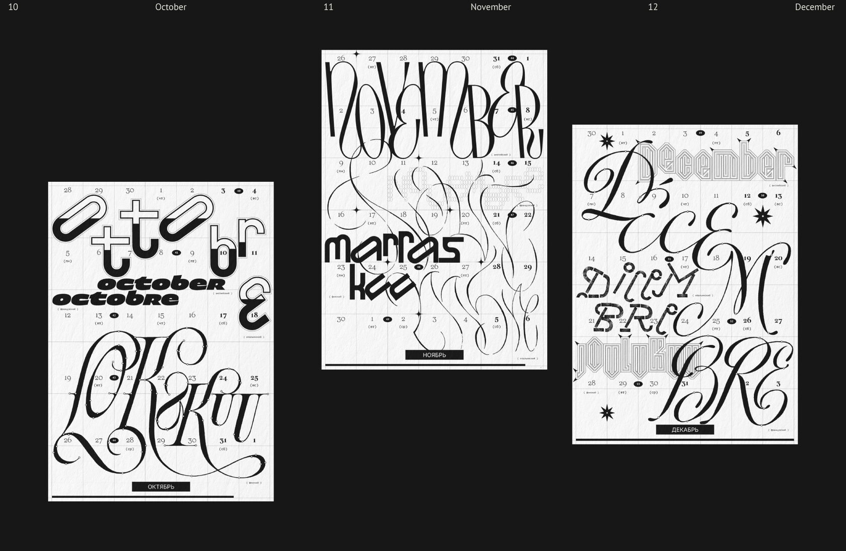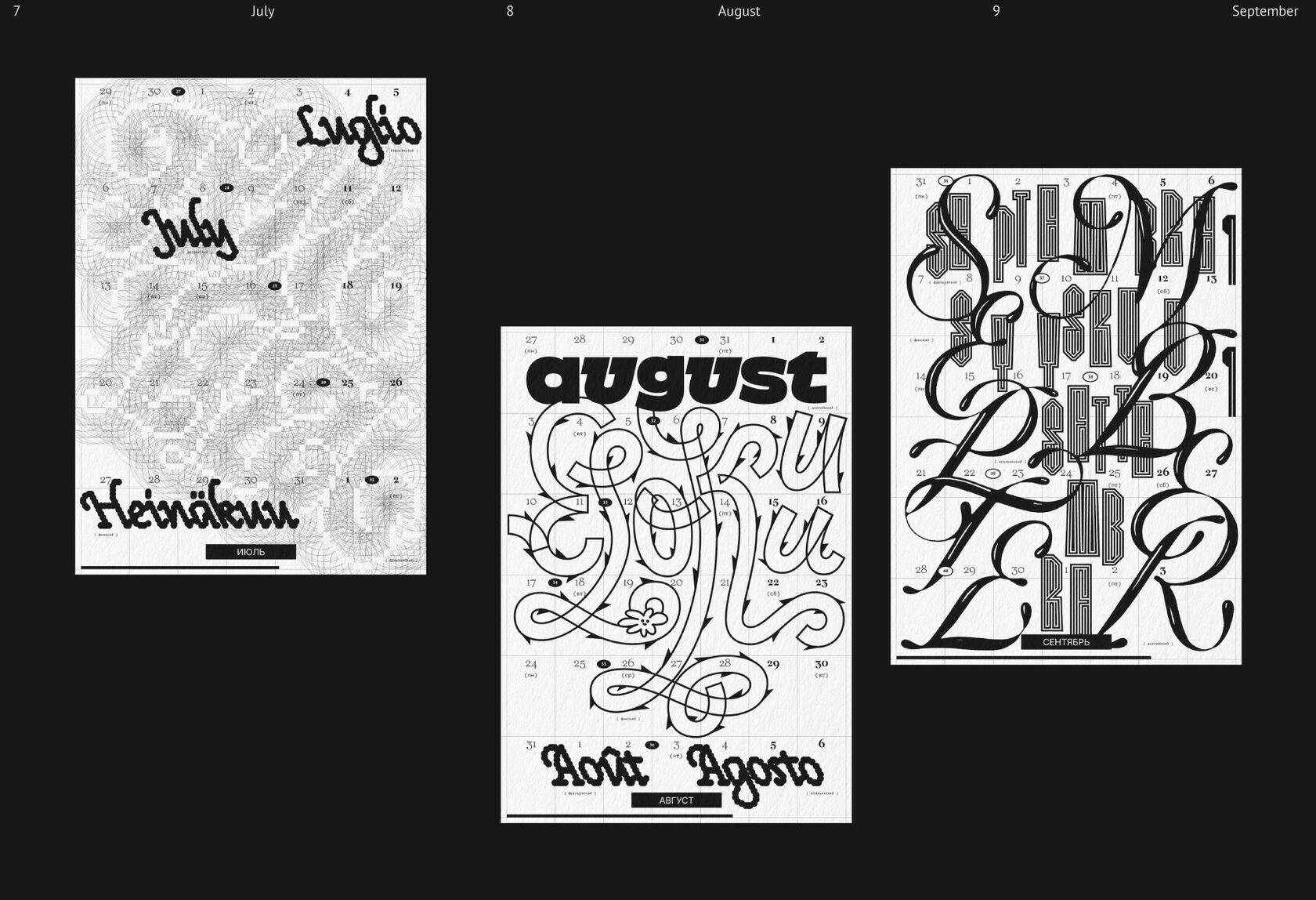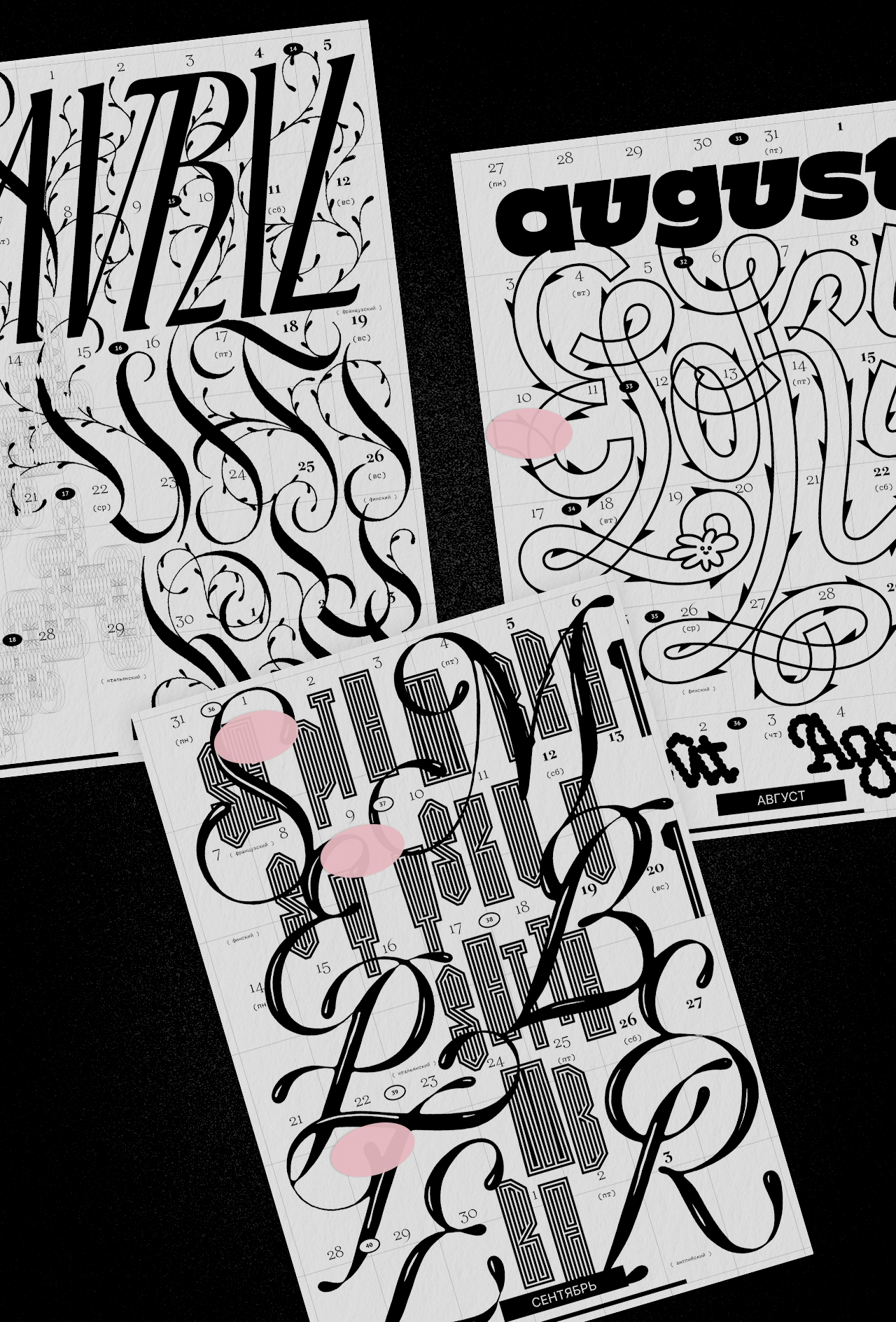 Леттеринг и шрифты в календаре говорят на разных языках: татарский, русский, финский, турецкий, английский, французский, хорватский, польский, португальский, исландский, латвийский, венгерский, чешский, белорусский, украинский, вьетнамский.