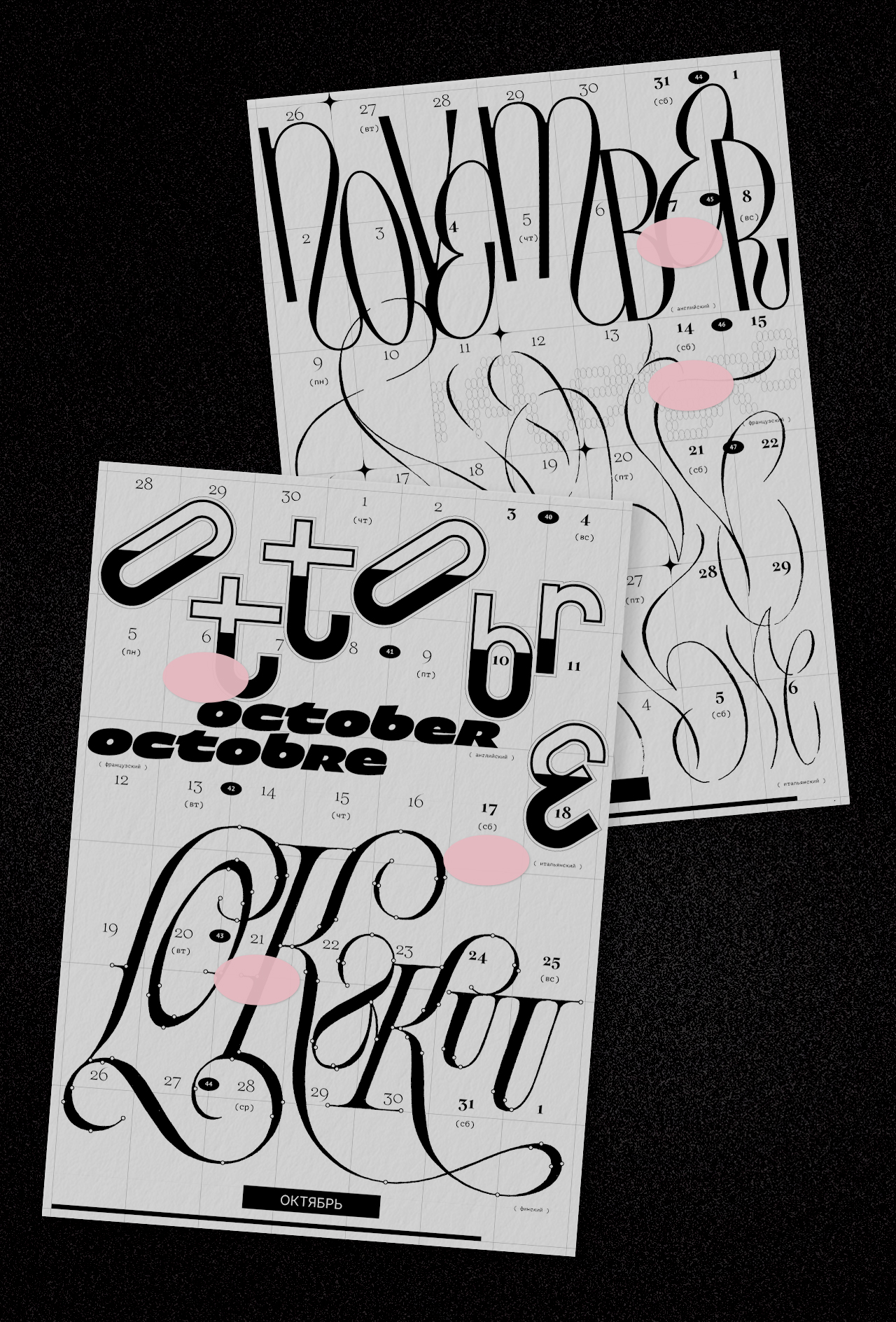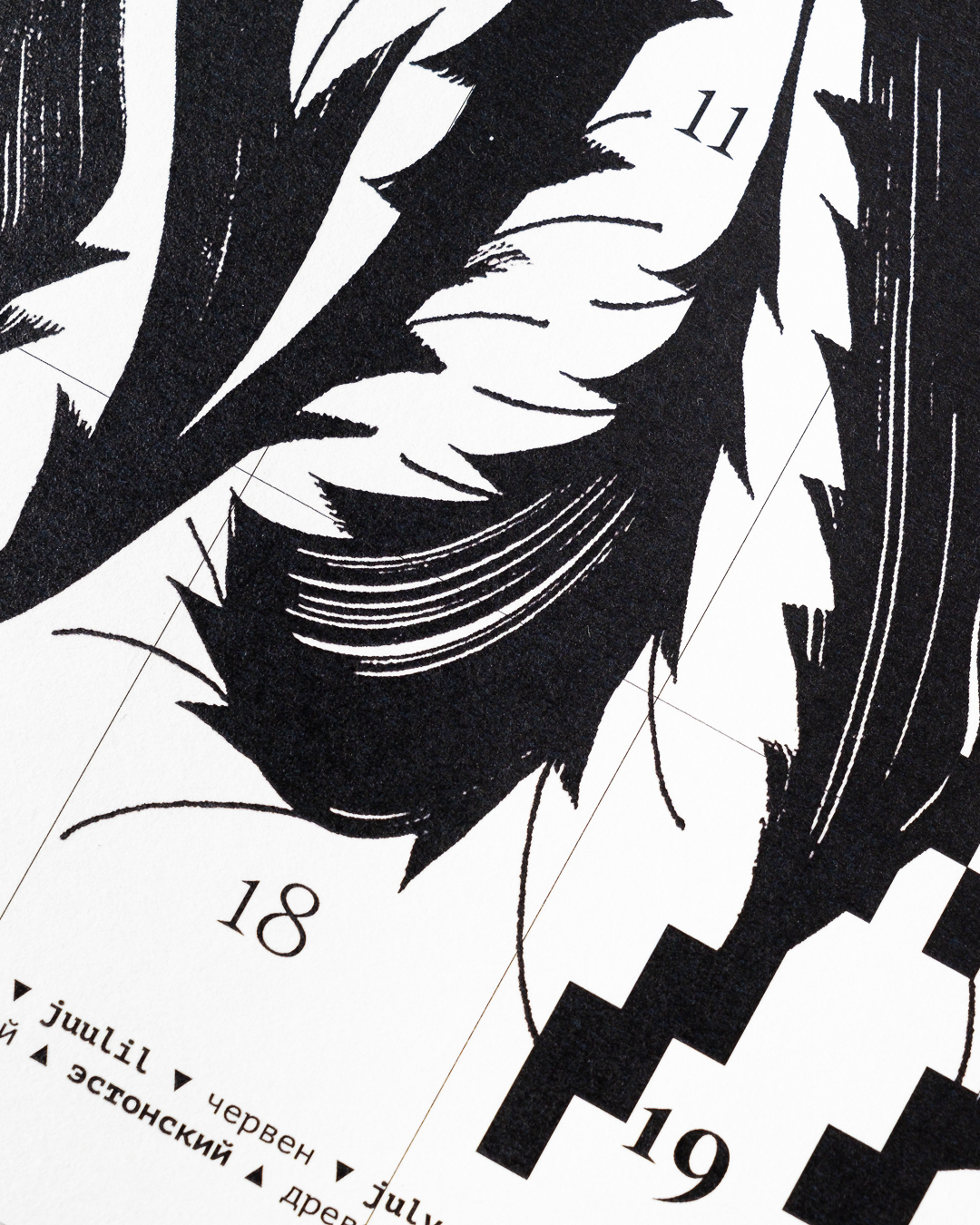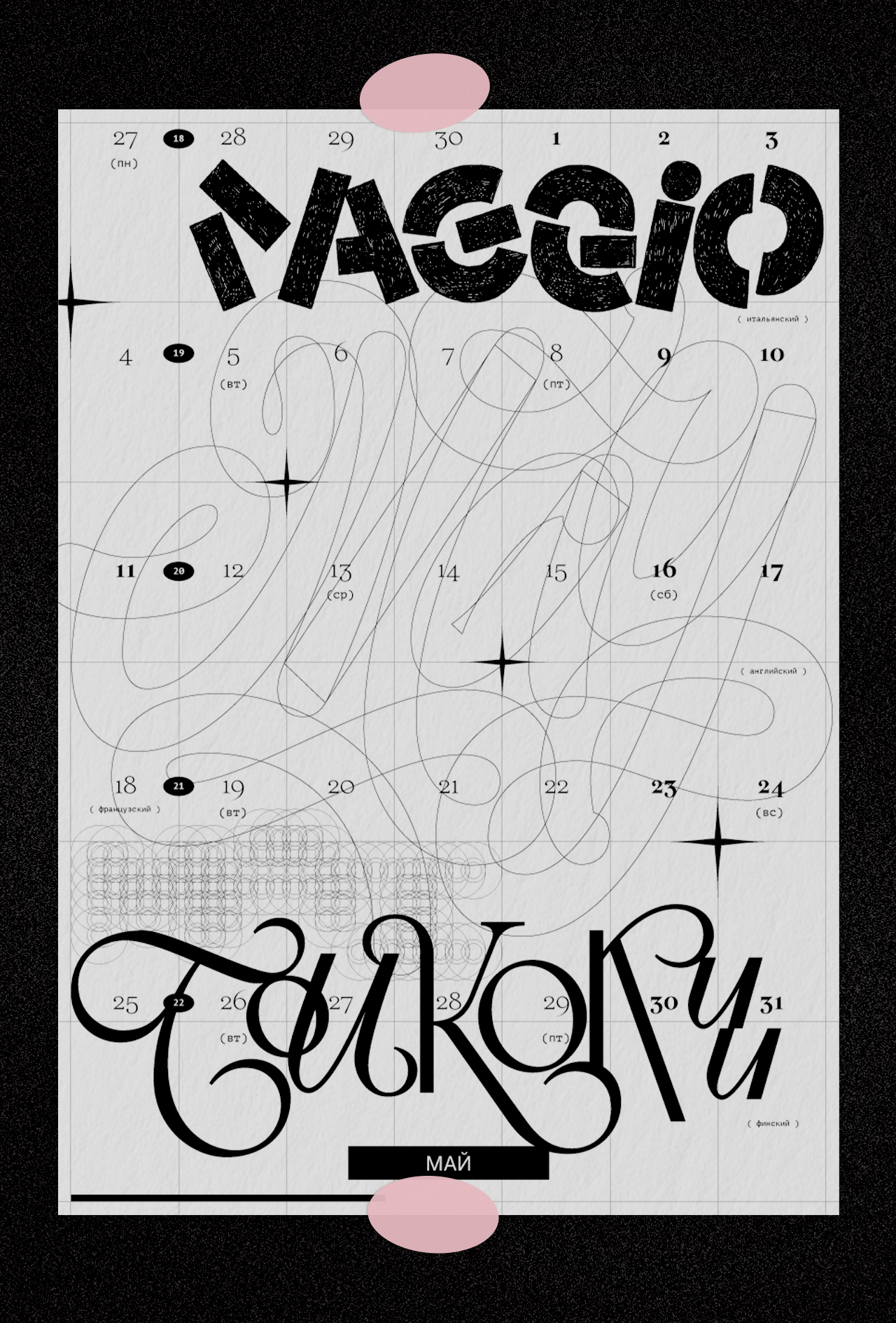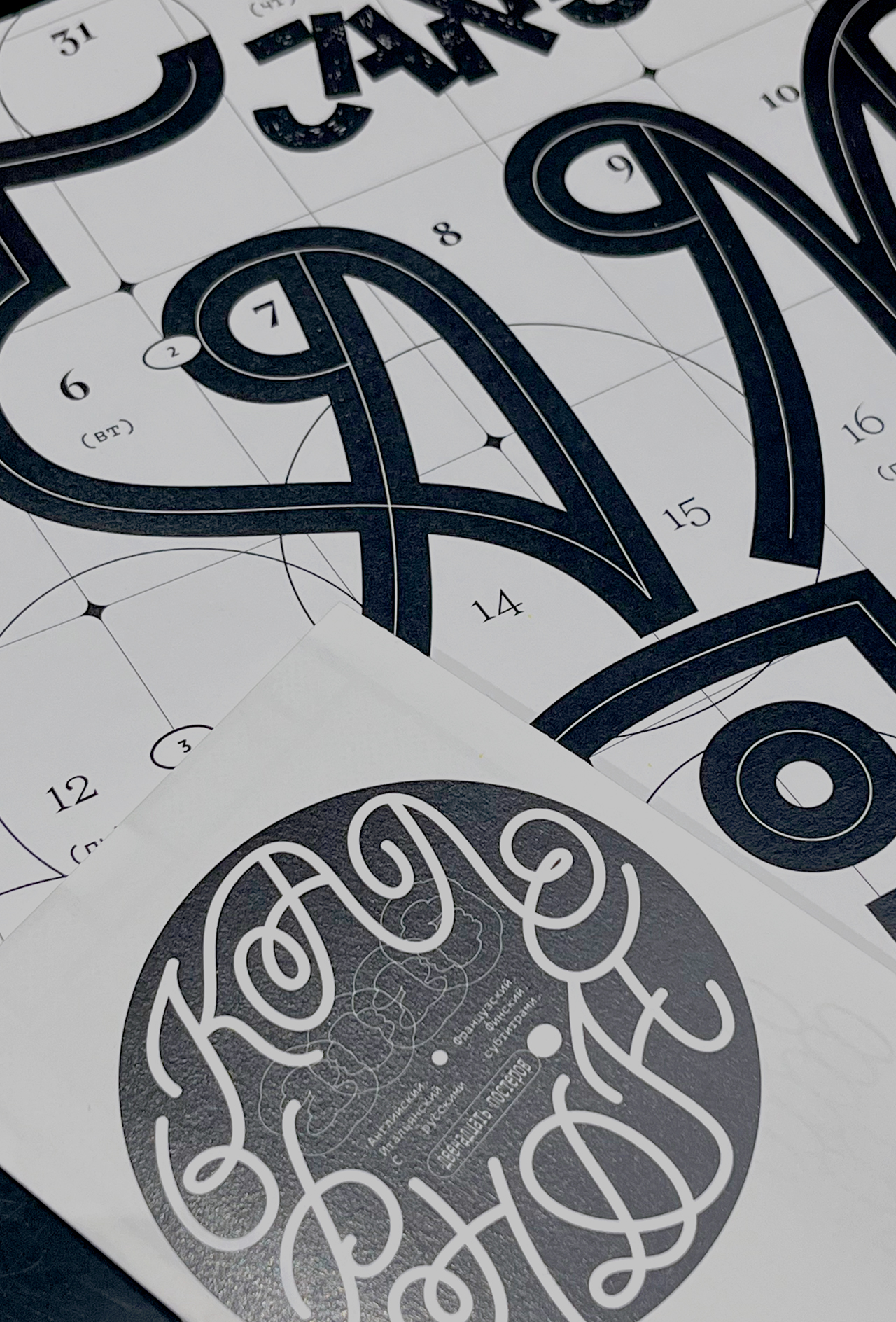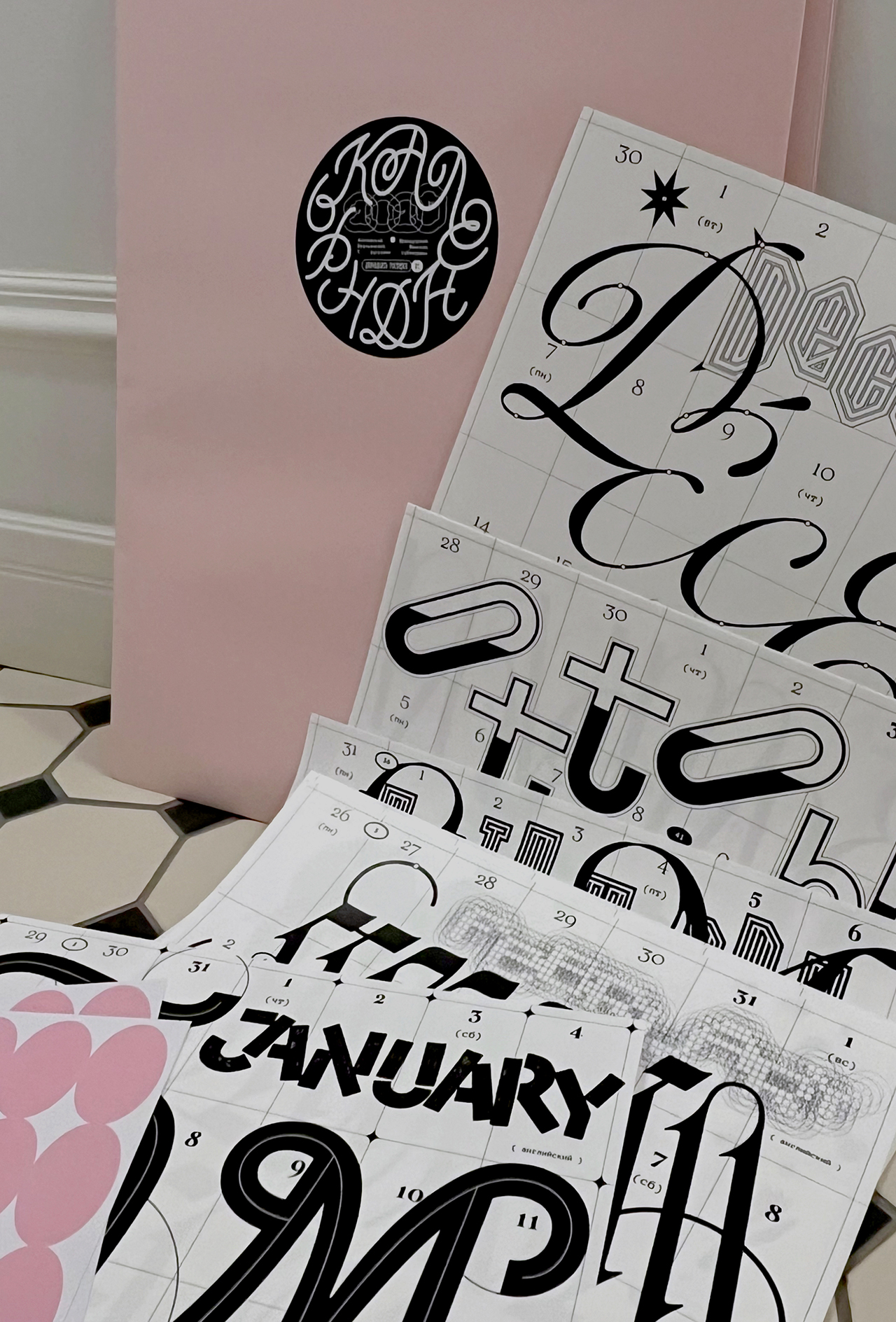 Леттеринг и шрифты в календаре говорят на разных языках: татарский, русский, финский, турецкий, английский, французский, хорватский, польский, португальский, исландский, латвийский, венгерский, чешский, белорусский, украинский, вьетнамский.